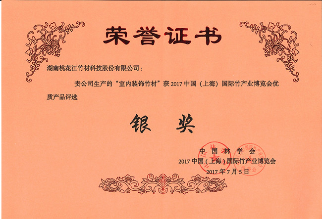 2017年7月,在中國(上海)國際竹產(chǎn)業(yè)博覽會(huì)產(chǎn)品評(píng)選中湖南桃花江竹材科技的室內(nèi)裝飾竹材榮獲銀獎(jiǎng)。該榮譽(yù)是對(duì)桃花江竹材科技的高度認(rèn)可,桃花江生產(chǎn)的室內(nèi)裝飾竹材取之天然,綠色環(huán)保,古樸自然,是有文化底蘊(yùn)的室內(nèi)裝修裝飾材料,是木材的理想替代品。