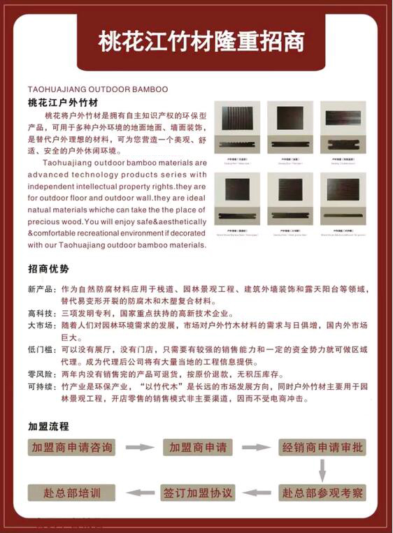 湖南桃花江竹材科技股份有限公司是湖南生產(chǎn)環(huán)保竹材的廠家,地處提名"楠竹之鄉(xiāng)"——湖南益陽市桃江縣,竹子資源得天獨(dú)厚。公司成立于2001年7月,注冊資金5076萬,為湖南省農(nóng)業(yè)產(chǎn)業(yè)化龍頭企業(yè)和湖南省林業(yè)工業(yè)龍頭企業(yè),“桃花江”牌系列竹材為湖南竹材產(chǎn)品。公司為中國林重點(diǎn)龍頭企業(yè)和國家高新技術(shù)企業(yè)。公司通過了ISO9001:2008國際質(zhì)量體系認(rèn)證和ISO14001:2004環(huán)境管理體系認(rèn)證。
